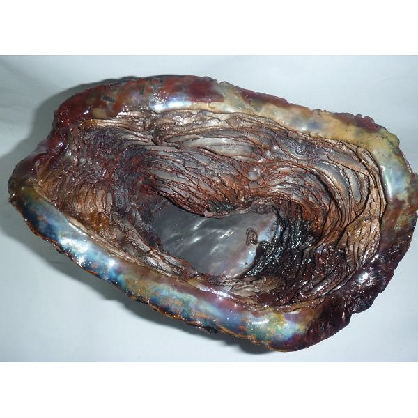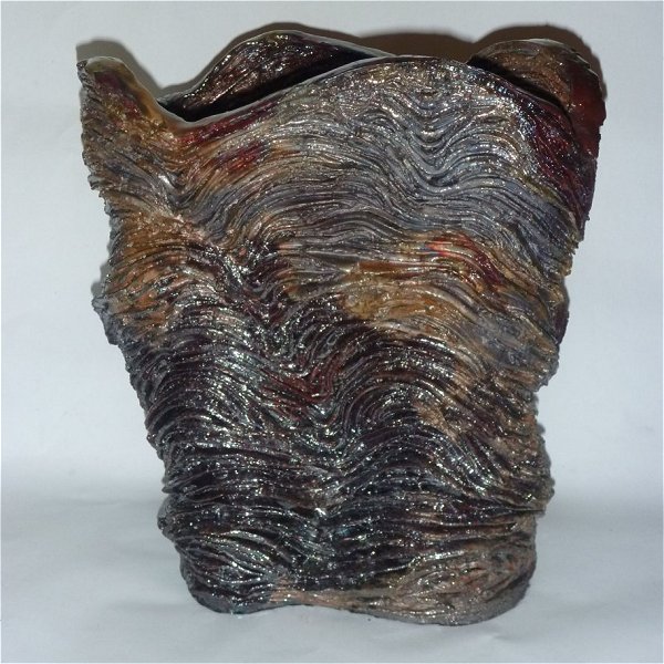 "Layered" - as the pieces are made up of many individual layers, that come together to form the whole. Each piece echoes the ebb and flow of water, creating rhythm in the movement of the clay as well as using a glaze that starts flowing when it is fired to 1280 degrees. There are also some Raku pieces that were inspired by the afternoon reflections on the water.