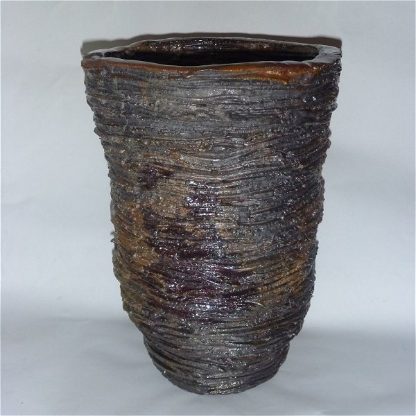 "Layered" - as the pieces are made up of many individual layers, that come together to form the whole. Each piece echoes the ebb and flow of water, creating rhythm in the movement of the clay as well as using a glaze that starts flowing when it is fired to 1280 degrees. There are also some Raku pieces that were inspired by the afternoon reflections on the water.